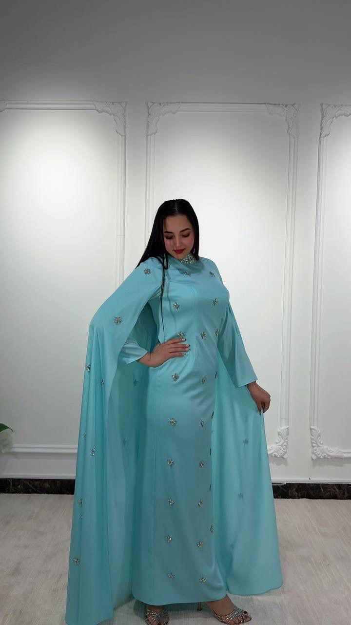 فستان سهرة شرقي خليجي، يتميز بقصة فضفاضة مع أكمام واسعة تشبه الوشاح، مزين بتطريزات لامعة منتشرة على طول الفستان، مناسب للمناسبات والاعراس.
