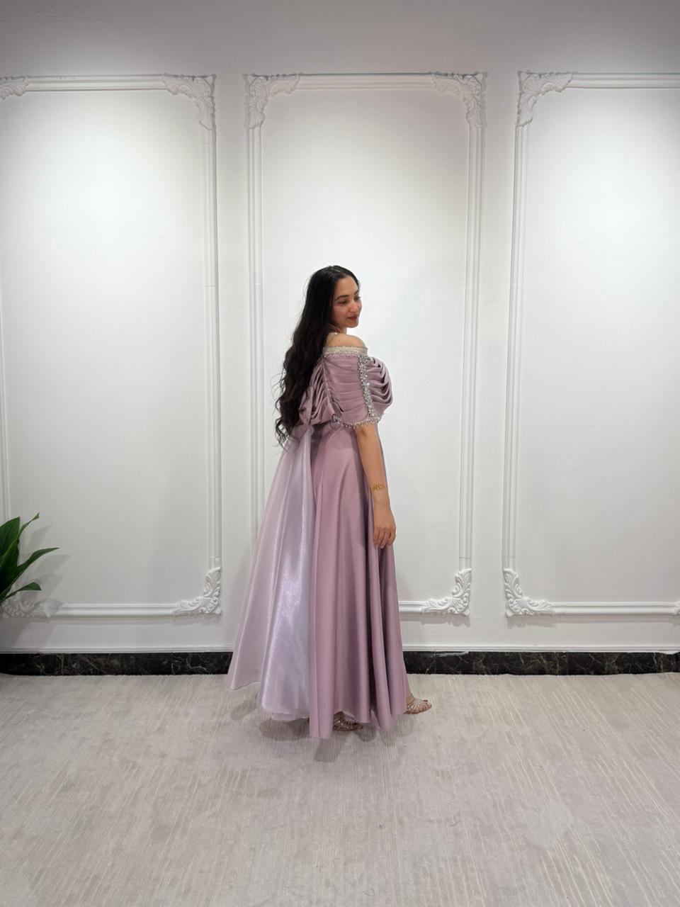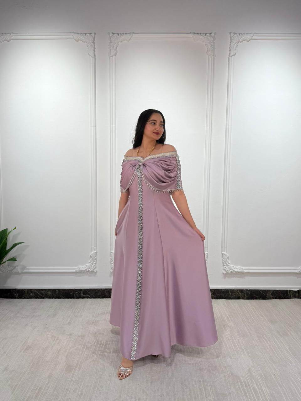 فستان سهرة بقصة أوف شولدر يحتوي على تفاصيل مطرزة بالتطريزات التالية، وتنسدل بقصة فضفاضة، أنيقة وجذابة ومناسبة للمناسبات والأعراس.