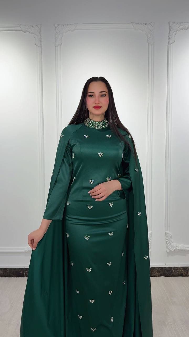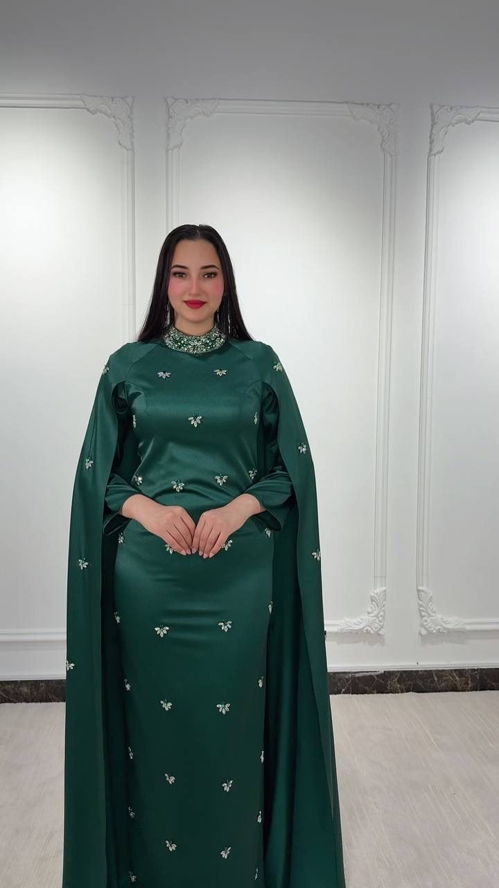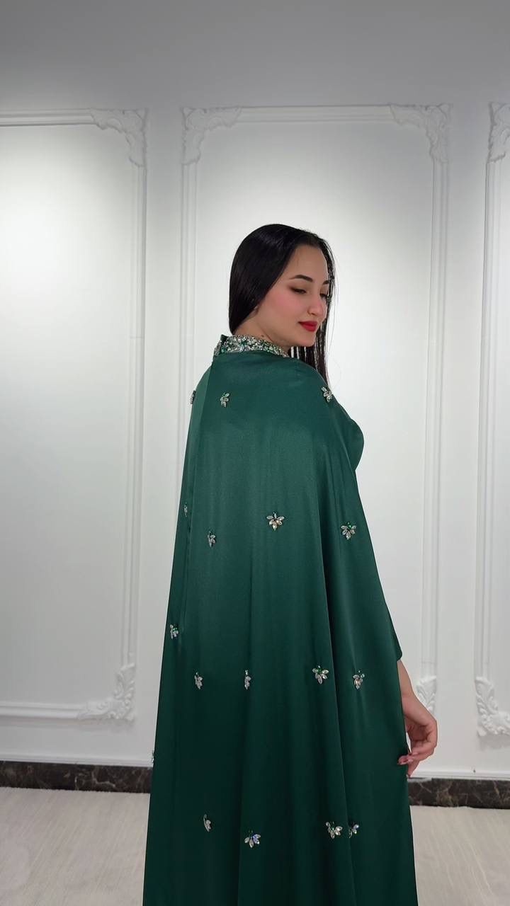 فستان سهرة شرقي خليجي، يتميز بقصة فضفاضة مع أكمام واسعة تشبه الوشاح، مزين بتطريزات لامعة منتشرة على طول الفستان، مناسب للمناسبات والاعراس.