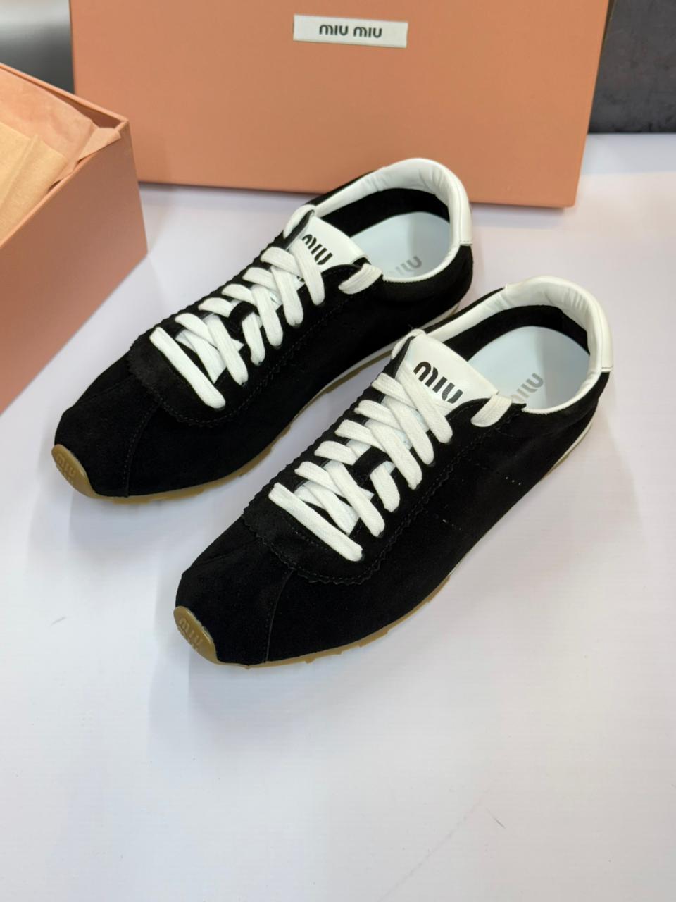 حذاء رياضي عملي من الشمواه مريح وانيق بأربطة للإغلاق مع شعار العلامة التجارية ميو ميو
